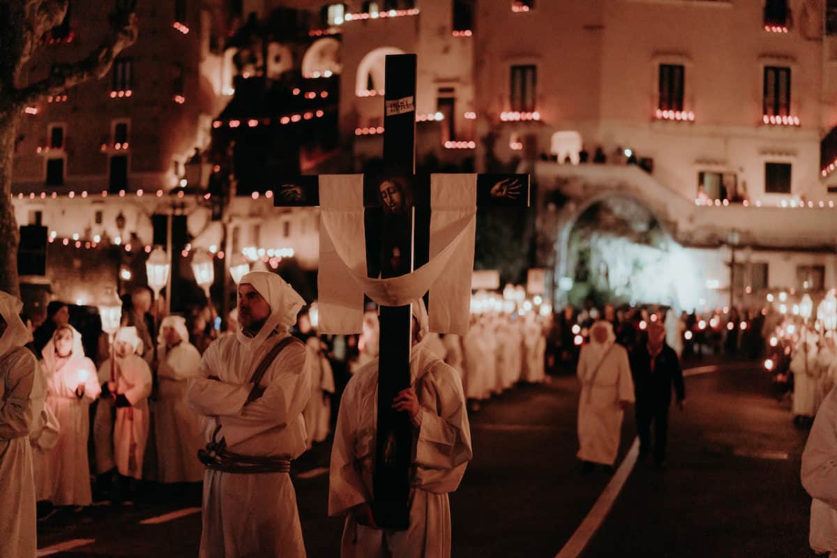 “Il Padreterno ce lo mette nel sangue!” Dicono gli anziani di Amalfi, lasciando percepire appieno il valore del ruolo che ricoprono. I Battenti, gli uomini incappucciati e vestiti con tonache bianche, sono figure salienti della Pasqua in Costa d’Amalfi ed i loro canti sono preghiere e suoni che si elevano al cielo, consegnati alla storia diventando tradizione. Conosciuti anche come peccatori incappucciati, riempiono le strade durante giorno e notte, scandendo i riti della Settimana Santa. Con i loro canti plurisecolari, riempiono vicoli e strade, slarghi e piazze seguendo un calendario ben preciso che fa tappa nelle chiese dei borghi costieri, rispettando ogni anno lo stesso rituale.