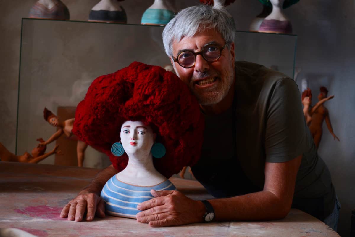 Lo studio sulla forma, il contatto con la materia e l’incontro con una donna lo portarono a dare forma alla collezione Regine del mare, busti femminili in terracotta coronati da spugne variopinte. «La serie è il mio tributo a Eleonora D’Aragona (figlia del re di Napoli, ndr) che vidi a Palermo ritratta nell’opera di Francesco Laurana. La sua bellezza mi stregò e io mi dissi che dovevo fare delle signorine preziose, delle regine del mare».  Disposte una accanto all’altra queste signorine esprimono carattere e personalità unica. Come la musa ispiratrice, ognuna di loro ha palpebre che sembrano quasi socchiuse. «L’idea del copricapo la ebbi con Luca, fu lui che mi aiutò a trovare le spugne e quando le misi in testa alle mie signorine, entrambi rimanemmo folgorati. Avevamo raggiunto la perfezione. Queste donne ci stavano parlando».