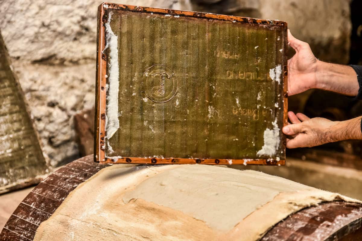 Ma come avveniva la creazione della carta? Qual era il suo processo di produzione? Per realizzare i vari fogli venivano utilizzati gli stracci, panni di cotone, che i cantieri acquistavano dai vari straccivendoli. Tali panni venivano messi in apposite vasche, chiamate pile, dove venivano triturati e trasformati in una sorta di poltiglia attraverso una serie di magli di legno, alla cui estremità erano sistemati dei chiodi di ferro. Si dice che la forma e la dimensione dei chiodi determinavano la consistenza, la grammatura e lo spessore dei fogli. Tale macchine erano mosse dalla forza dell’acqua che precipitando su di una ruota metteva in azione un albero di trasmissione detto fuso. La poltiglia creata dal macchinario veniva poi raccolta e messa in un tino in muratura, una vasca rotonda. Qui con una sorta di mestolo di legno di grandi dimensioni si mescolava la poltiglia, a questo punto si immergeva uno strumento simile a un setaccio, su cui vi era apposto la filigrana, il sigillo o simbolo della famiglia, sul quale si formava uno strato di carta che poi veniva versato sul feltro, che dava vita al primo foglio di carta. Foglio dopo foglio, ne servono circa 40-50, la “pila” creata veniva prelevata e passata  sotto a una pressa per che serviva all’assorbimento dell’acqua. Da qui poi si passava all’asciugatura dove i fogli venivano appesi sugli spanditoi. Nel 1745 la macchina a maglie di legno venne sostituita dalla macchina olandese, che ha permesso di velocizzare e perfezionare l’intero processo.