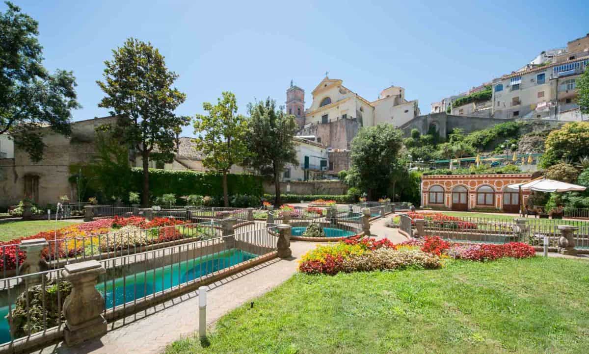 I giardini interni sono unici nel loro genere. Dalla curiosa forma a croce di Malta, dai violetti a roseto ci si affaccia su grosse vasche interrate, tutte comunicanti, percorse da una diramazione del Reginna: un bizzarro stratagemma per godere un po’ di frescura durante i mesi estivi. Una delle prime testimonianze riguardanti il palazzo e i giardini sono fornite da un illustre scrittore e viaggiatore britannico settecentesco, Lord Henry Swinburne. A settembre 1777 lo scrittore aveva intrapreso un viaggio verso Salerno. Risalendo per Cava, aveva raggiunto il santuario dell’Avvocata e discese verso Maiori. Qui descrive, nel suo libro Travel in Two Sicilies: “Fui ammesso in un giardino appartenente ad un signore adesso in viaggio che io ammirai con gran piacere per quanto esso era adornato in uno stile felicemente adatto alla posizione e al clima. Il palazzo è pulito e arieggiato e i giardini sono tagliati da canali d’acqua limpida, ciascuno dei quali crea forti corsi d’acqua tra ricchi e profumati giardinetti oppure di cascate attraverso grotte di conchiglie lavorate e ombreggiati pergolati.”